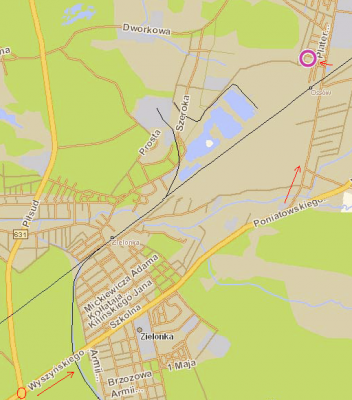 Różowe kółeczko to miejsce, gdzie będziemy. Czerwone, to rondo za Ząbkami. Strzałeczki to jak jechać od ronda.
